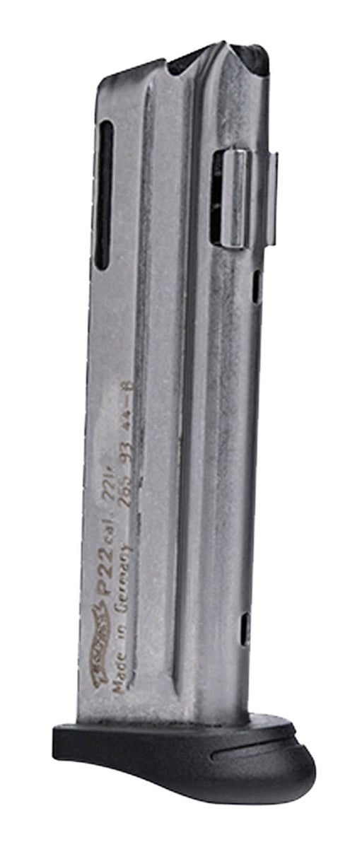 Out of stockCaliber: 22 LR Capacity: 10rd Finish: Nickel Model: P22 Material: Steel Type: Flat Base Model Fit: P22Q Brand Fit: Walther Capacity: 10