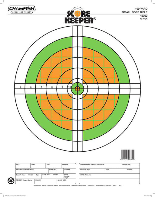 Champion Targets 45762 Score Keeper Sight-In Bullseye Paper Hanging 100 yds Small Bore Rifle Fluorescent Green & Orange/White 12 PK