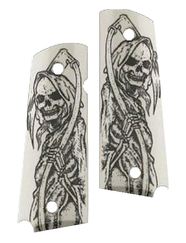 Out of stockType: Grip Panels Model: Scrimshaw Grip Finish: Ivory w/Grim Reaper Material: Polymer Color: Ivory with Full Body Grim Reaper Height: N/A Medallio...